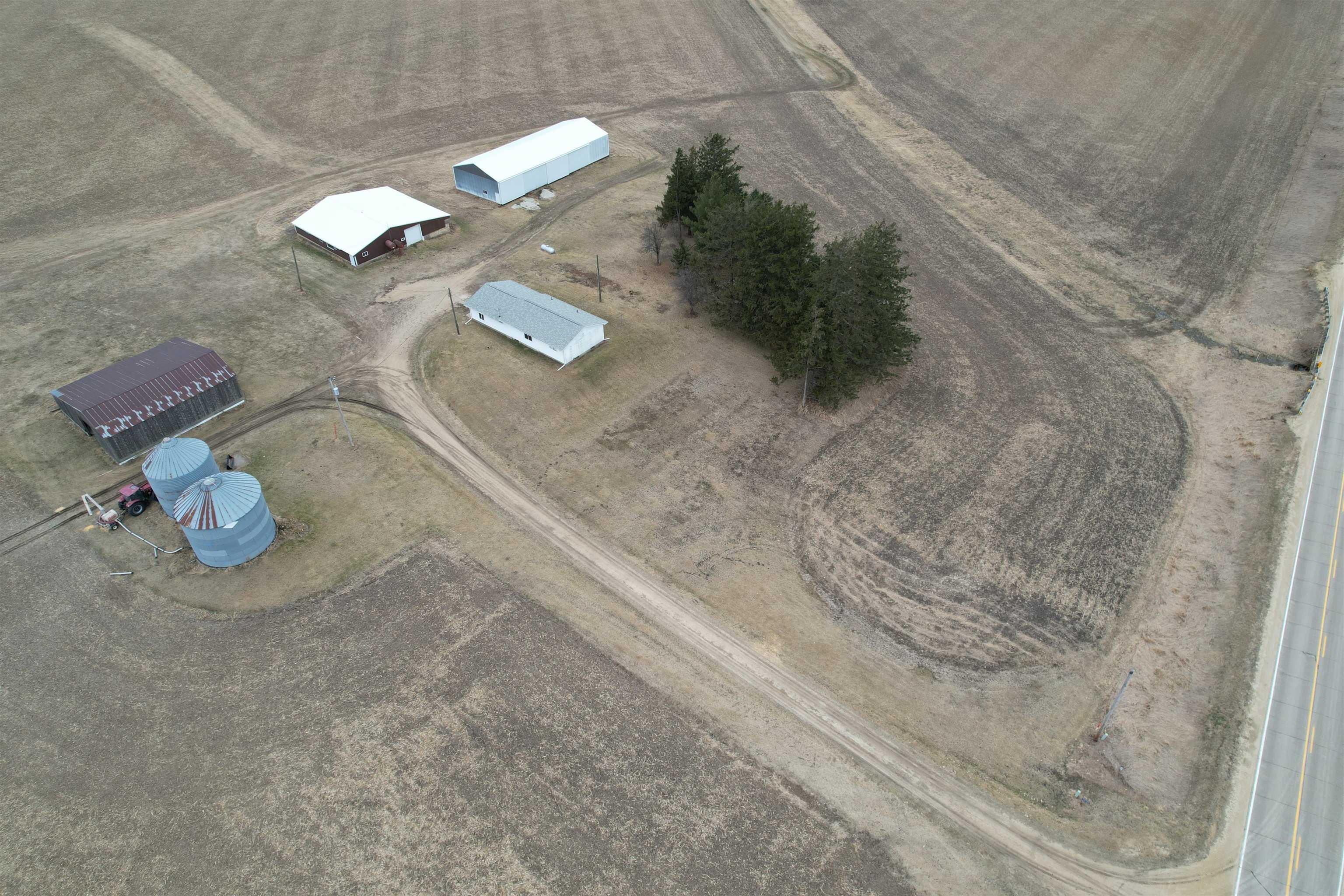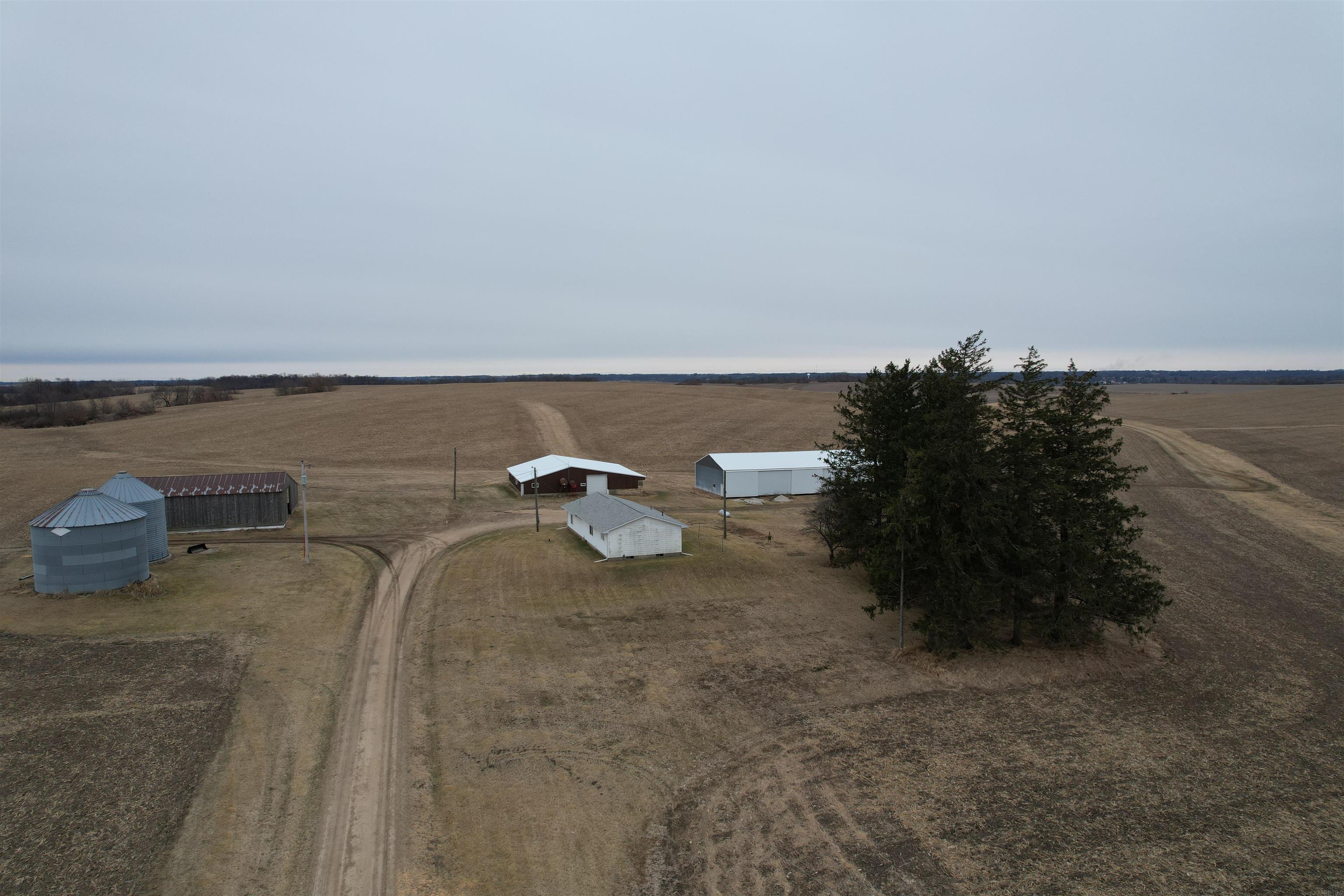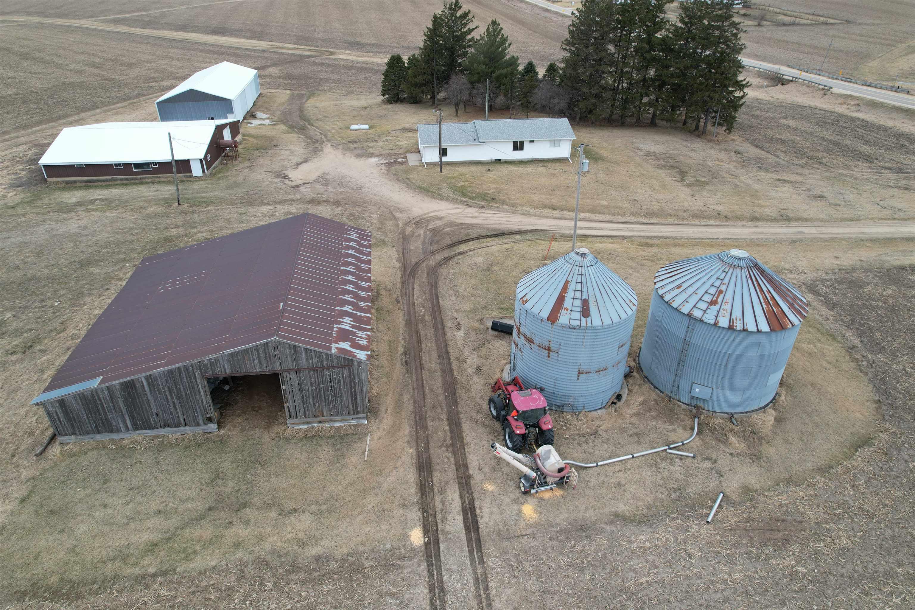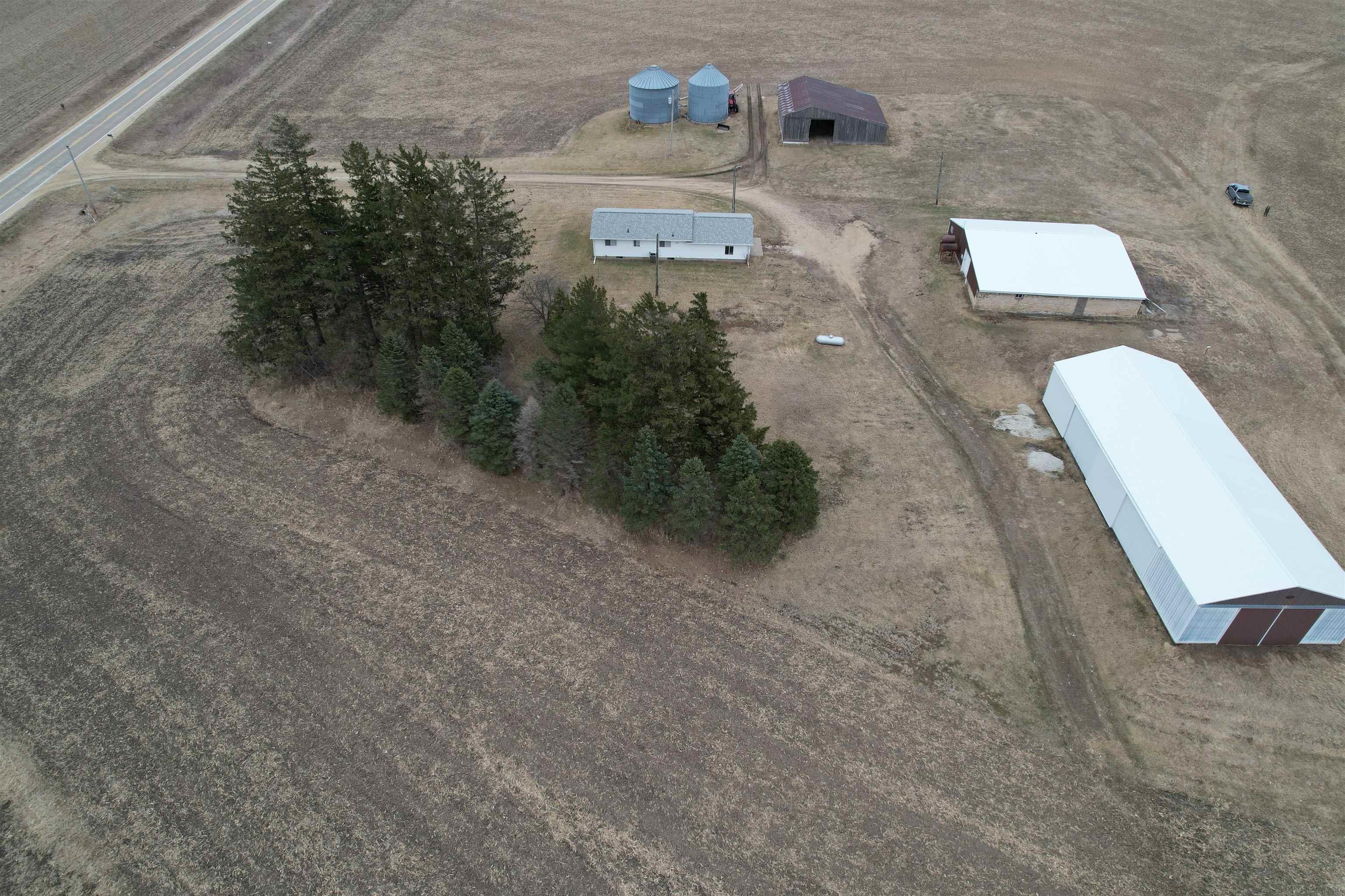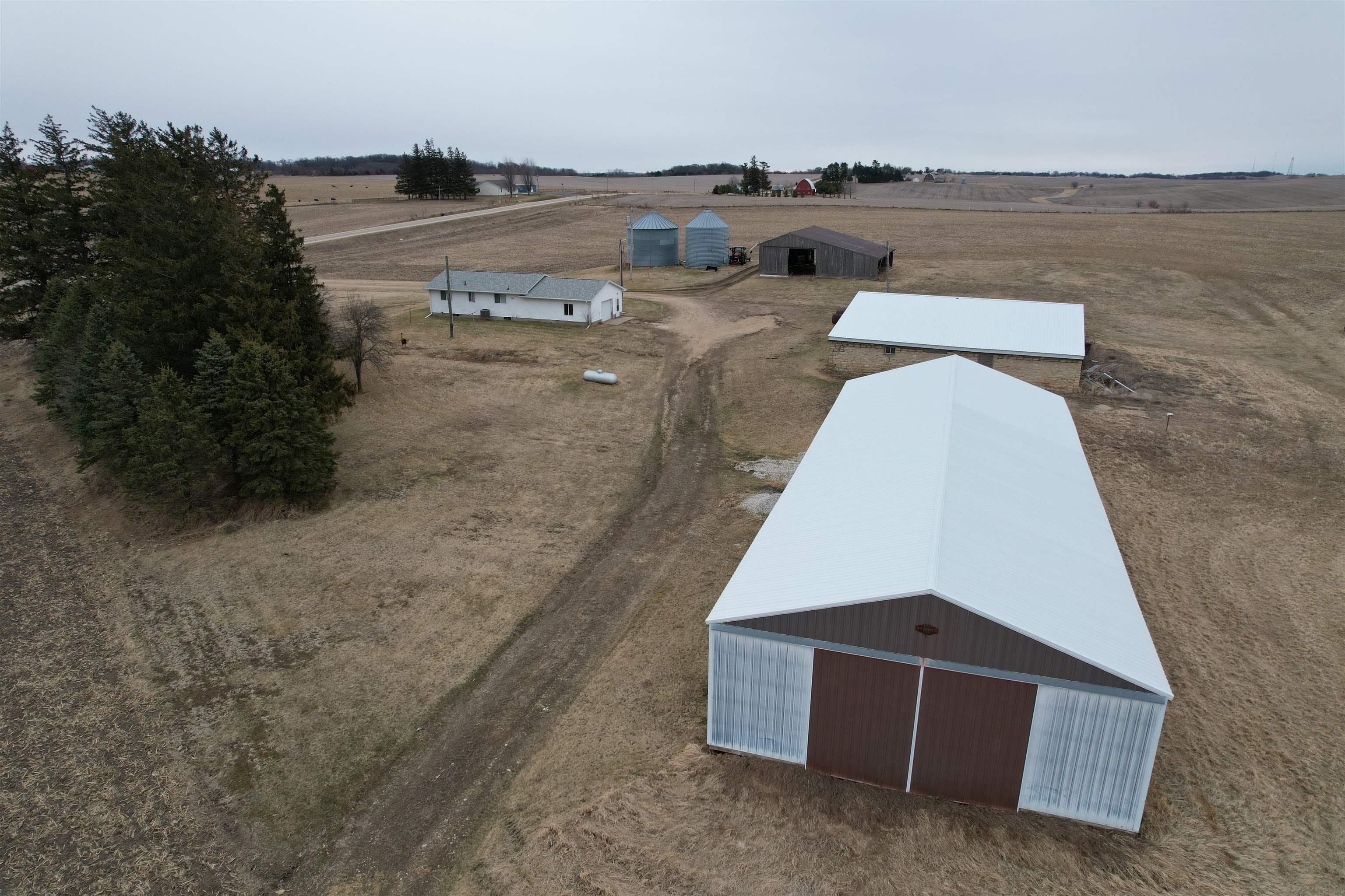 Acreage Alert! Exact acres and lines to be determined by seller and buyer at accepted offer. Some adjustment may be done to price in reference to amount of land surveyed. The listed price is for approximately 4 Acres M/L., with a ranch style home featuring 2 bedrooms and a full bath on the main floor along with a galley style kitchen with a few unique touches. The living/dining room also has a corner that once had a wood-burning stove but could be renovated to either add one or to remove and use the additional space. There is a full basement with the laundry facilities on this lower level. The attached garage has a single garage door but has plenty of room for two cars. On this 4+ acres, there are two grain bins, an older loafing barn, a 40 x 100 machine shed, and a 26 x 52 machine shed, plus a few older buildings. This property is located less than a mile from Highway 151 and is on a hard-surface road. This is sold in AS IS condition. The setting offers both privacy and convenience, making it ideal for those seeking rural living with quick access to main routes. Don’t sleep on this one! Call today for your private showing.